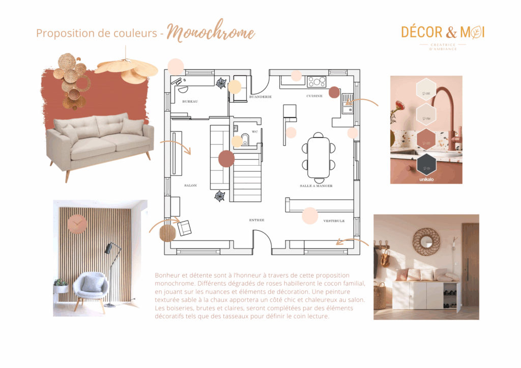 Revoir l’emplacement des pièces, les points électriques, proposer matériaux, tissus, couleurs… un beau projet de décoration rénovation réalisé pour une famille.