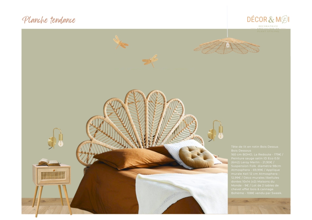 J’ai sélectionné un mobilier et des accessoires en rotin et en doré. Ces matières apportent élégance et chaleur. Elles s’harmonisent parfaitement avec le vert sauge. L’ensemble renforce l’ambiance intime et enveloppante souhaitée par le couple.